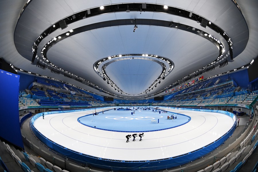 Skaters take part in a training session at the National Speed Skating Oval on Jan. 30, 2022. (Xinhua/Wu Wei)