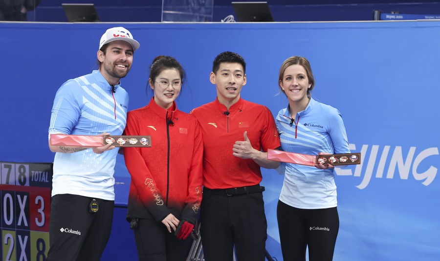 Fan Suyuan (2nd L) and Ling Zhi (2nd R) of China pose for photos with Christopher Plys (L) and Vicky Persinger of the United States after their curling mixed doubles match at the National Aquatics Center on Feb. 5, 2022. (Xinhua/Wang Jingqiang)