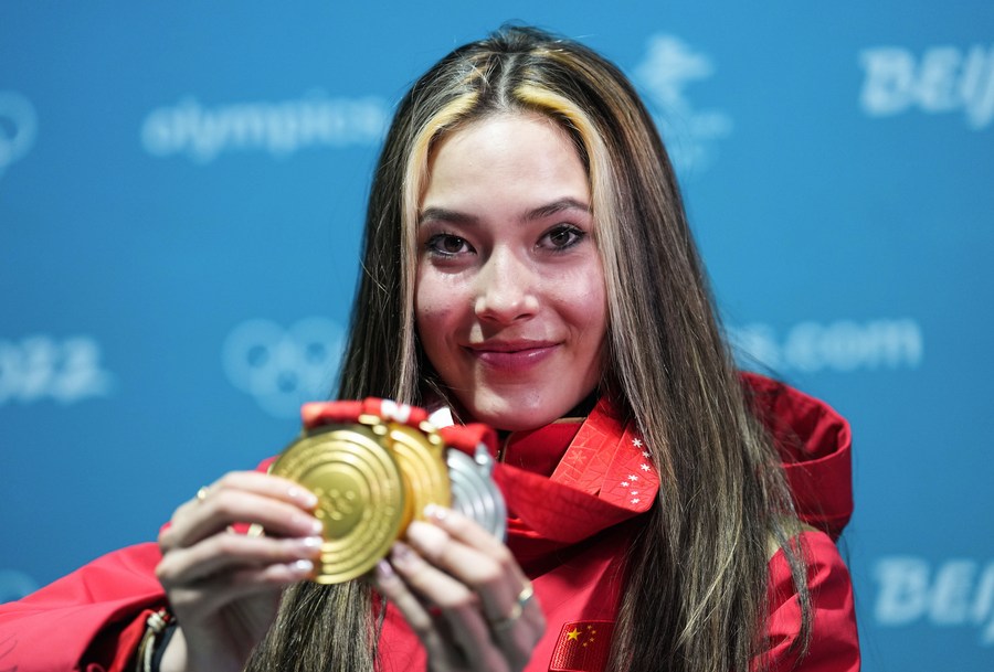 Gold medalist Gu Ailing shows her medals after the award ceremony for the women's freeski halfpipe at Zhangjiakou Medals Plaza on Feb. 18, 2022. (Xinhua/Xue Yubin)