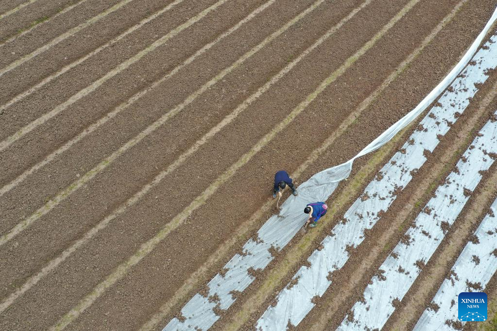Farmers work in the field at an agricultural base in Rongjiang County, southwest China's Guizhou Province, Feb. 19, 2022. Saturday marks the day of Yushui, or Rain Water, the second of the solar terms. As Yushui arrives, the temperature will rise and rain will become frequent. Farmers across Guizhou are busy with spring agricultural production. (Xinhua/Yang Wenbin)