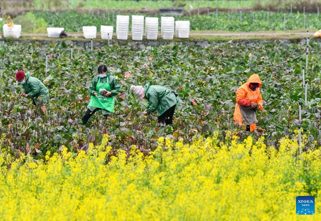 Farmers reap broccoli at an agricultural base in Wuliqiao Village of Yuping Dong Autonomous County in Tongren City, southwest China's Guizhou Province, Feb. 19, 2022. Saturday marks the day of Yushui, or Rain Water, the second of the solar terms. As Yushui arrives, the temperature will rise and rain will become frequent. Farmers across Guizhou are busy with spring agricultural production. (Photo by Liu Dejun/Xinhua)