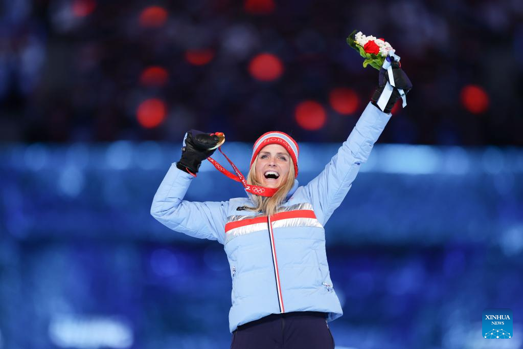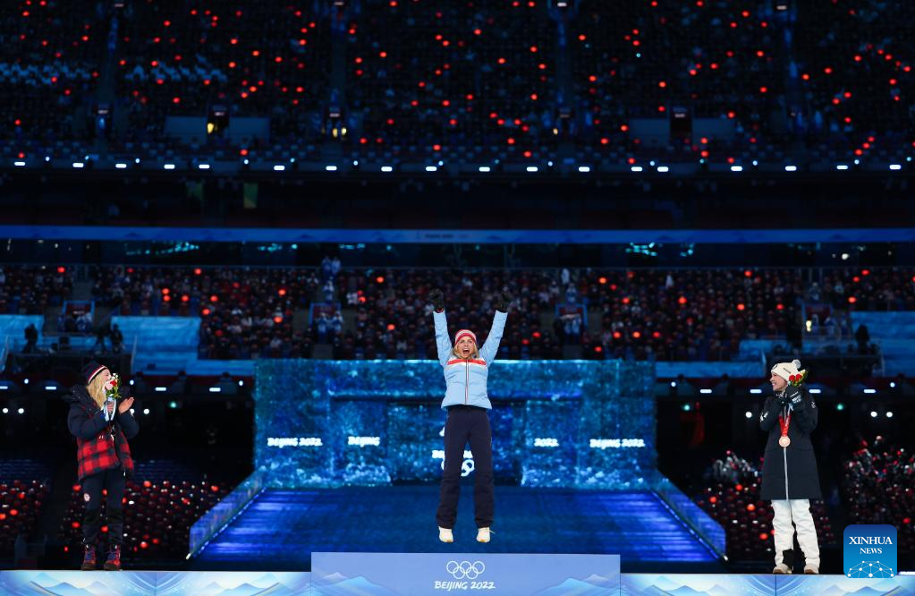 Gold medalist Therese Johaug of Norway reacts during the Victory Ceremony of the cross-country skiing women's 30km mass start free event during the closing ceremony of the Beijing 2022 Olympic Winter Games at the National Stadium in Beijing, capital of China, Feb. 20, 2022. (Xinhua/Cao Can)