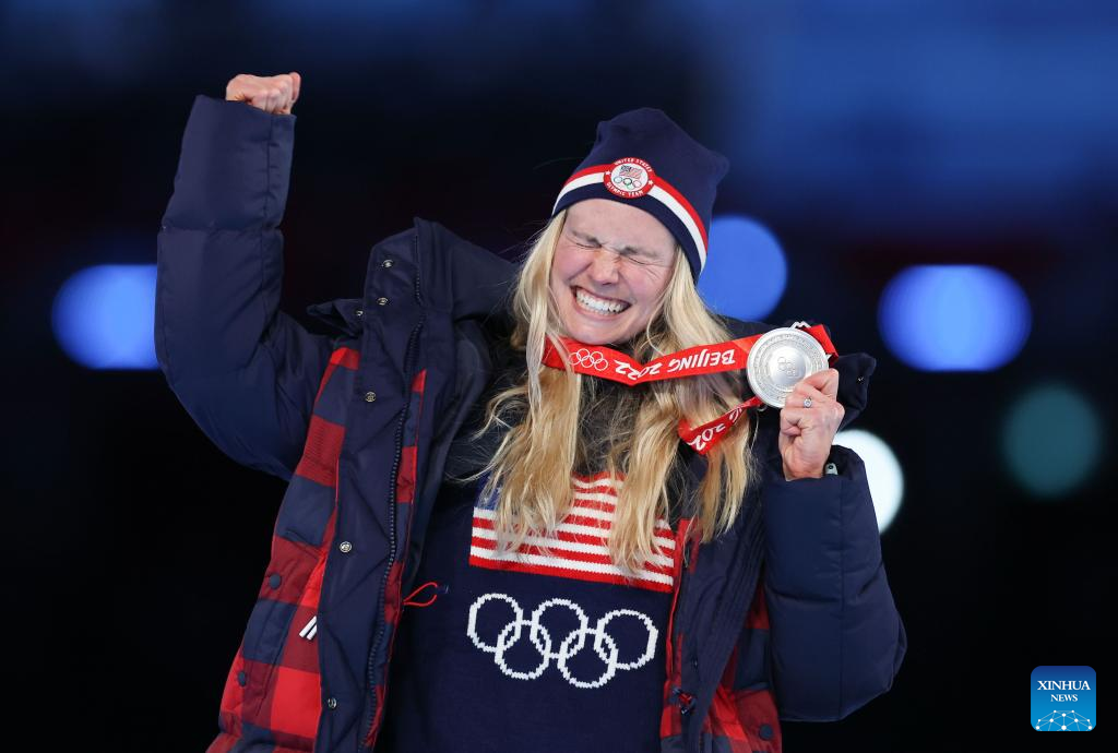Silver medalist Jessie Diggins of the United States reacts during the Victory Ceremony of the cross-country skiing women's 30km mass start free event during the closing ceremony of the Beijing 2022 Olympic Winter Games at the National Stadium in Beijing, capital of China, Feb. 20, 2022. (Xinhua/Cao Can)