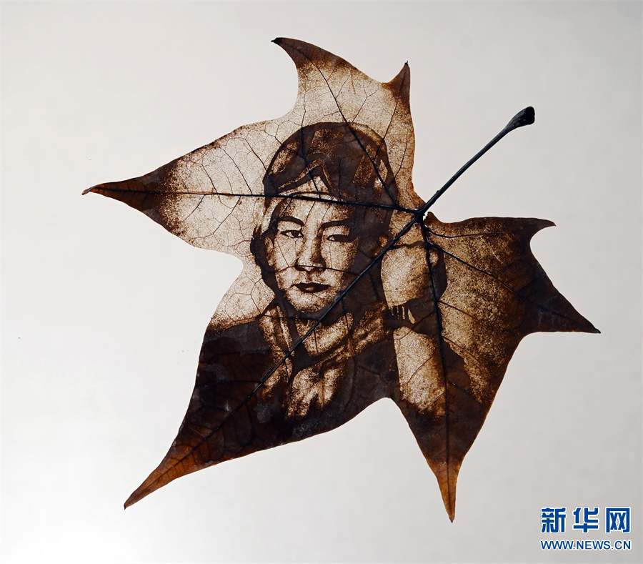 Photo shows Chen Liming’s leaf carving work with an image of Chinese speed skater Wu Dajing. (Photo/Yang Fan)