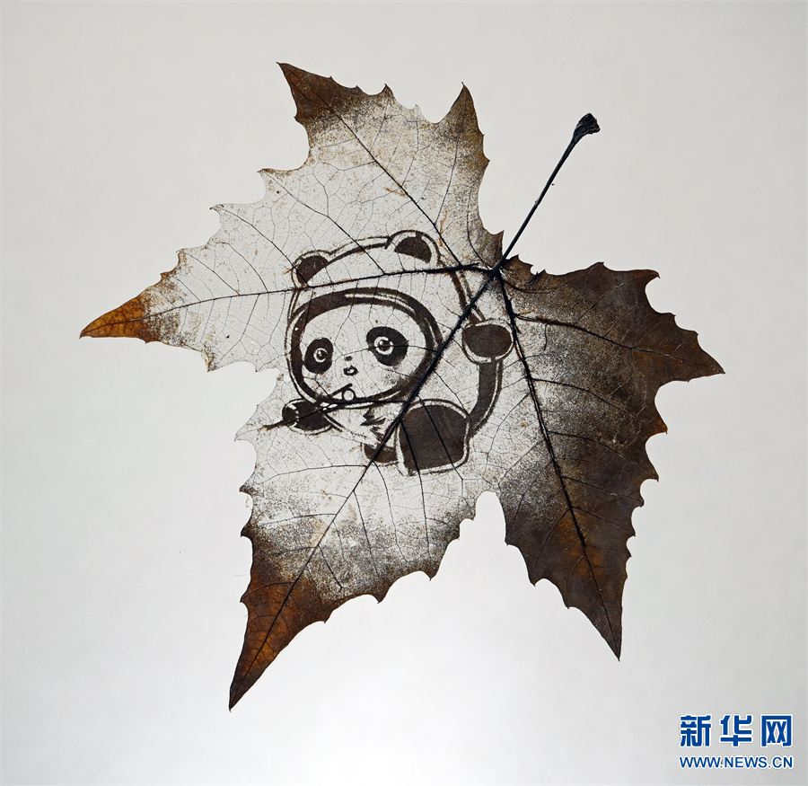 Photo shows a leaf carving work with the pattern of Bing Dwen Dwen, the mascot for the Beijing 2022 Olympic Winter Games, created by Chen Liming. (Photo/Yang Fan)