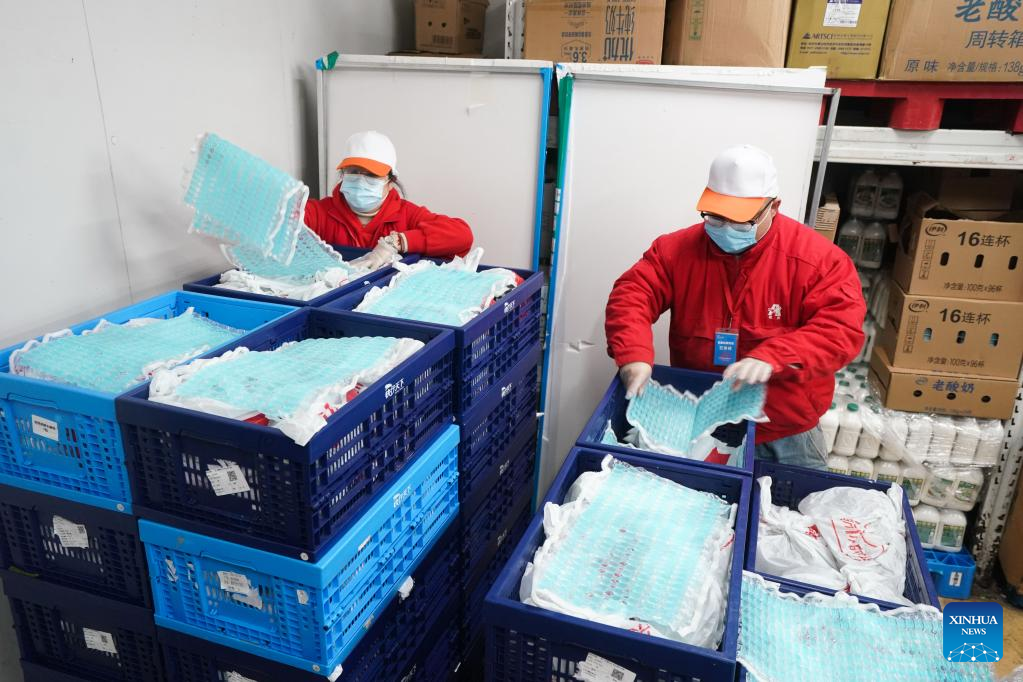 Supermarket workers cover vegetable packages with ice bags at Suzhou Industrial Park in Suzhou, east China's Jiangsu Province, Feb. 20, 2022. A number of large supermarkets at Suzhou Industrial Park have been mobilized to provide vegetable packages for residents in quarantine to meet their daily needs since the recent resurgence of COVID-19 cases in the city. (Xinhua/Ji Chunpeng)