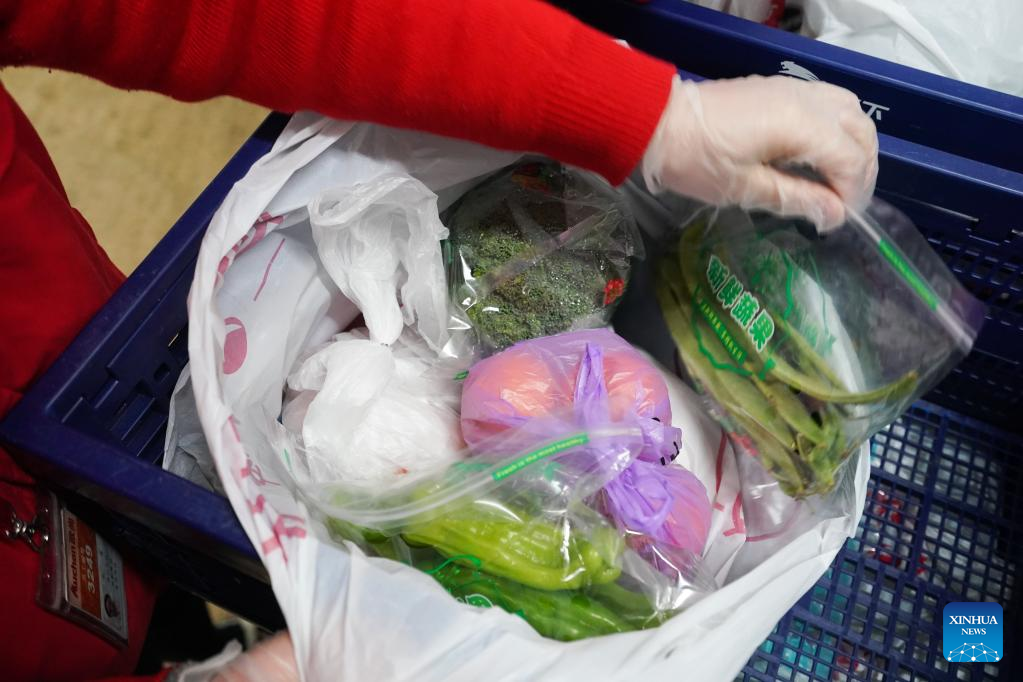 A supermarket worker prepares vegetable packages at Suzhou Industrial Park in Suzhou, east China's Jiangsu Province, Feb. 20, 2022. A number of large supermarkets at Suzhou Industrial Park have been mobilized to provide vegetable packages for residents in quarantine to meet their daily needs since the recent resurgence of COVID-19 cases in the city. (Xinhua/Ji Chunpeng)