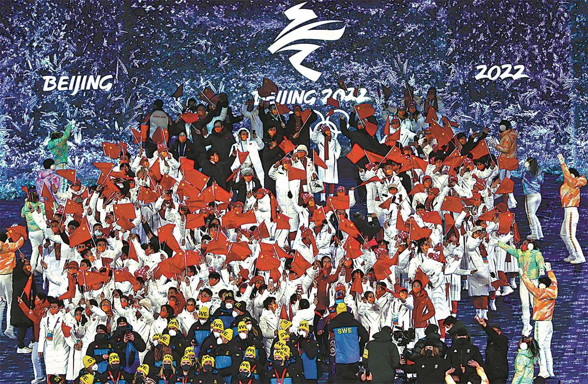 Members of the Chinese delegation, which won nine gold medals, four silver and two bronze at the Beijing Games, celebrate when they appear at the closing ceremony. ZHANG WEI/CHINA DAILY
