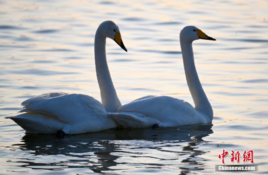 A pair of whooper swans share an intimate moment at Yinghua Lake, Rongcheng city in east China's Shandong Province, Feb. 21, 2022. (Photo: China News Service/Yang Zhili)