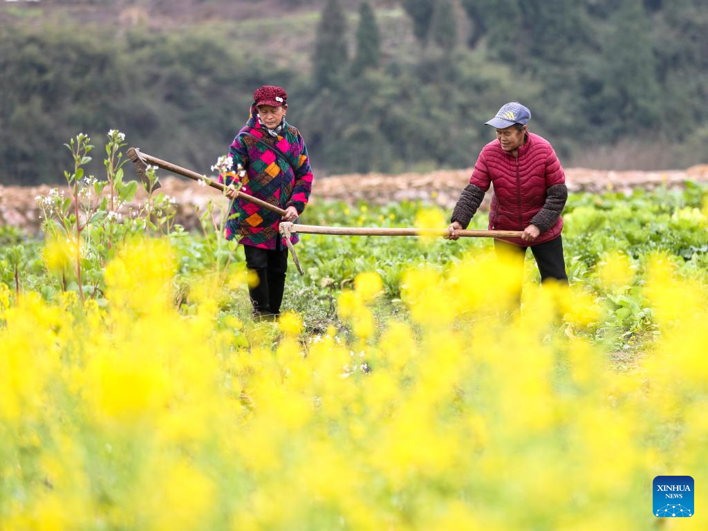 Villagers work in a field in Xindian Town of Yuping Dong Autonomous County in Tongren City, southwest China's Guizhou Province, Feb. 21, 2022. Farming activities are in full swing across the country. (Photo by Hu Panxue/Xinhua)