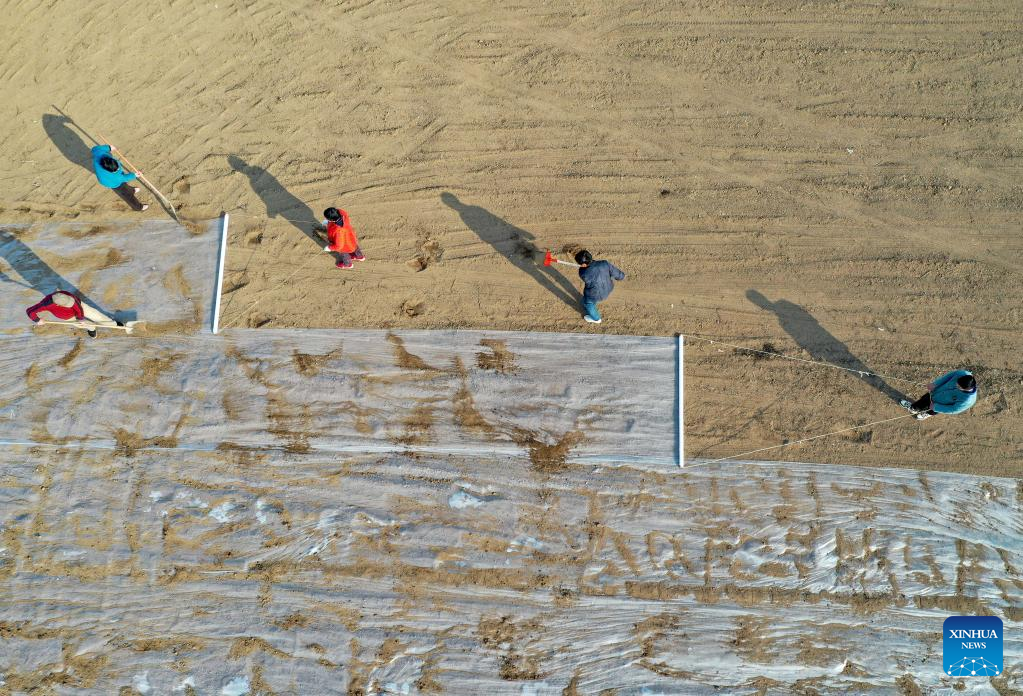 Aerial photo taken on Feb. 21, 2022 shows villagers covering the herbs they grow with mulch in Weili Village of Shihe Town, Bozhou, east China's Anhui Province. Farming activities are in full swing across the country. (Photo by Liu Qinlianhui/Xinhua)