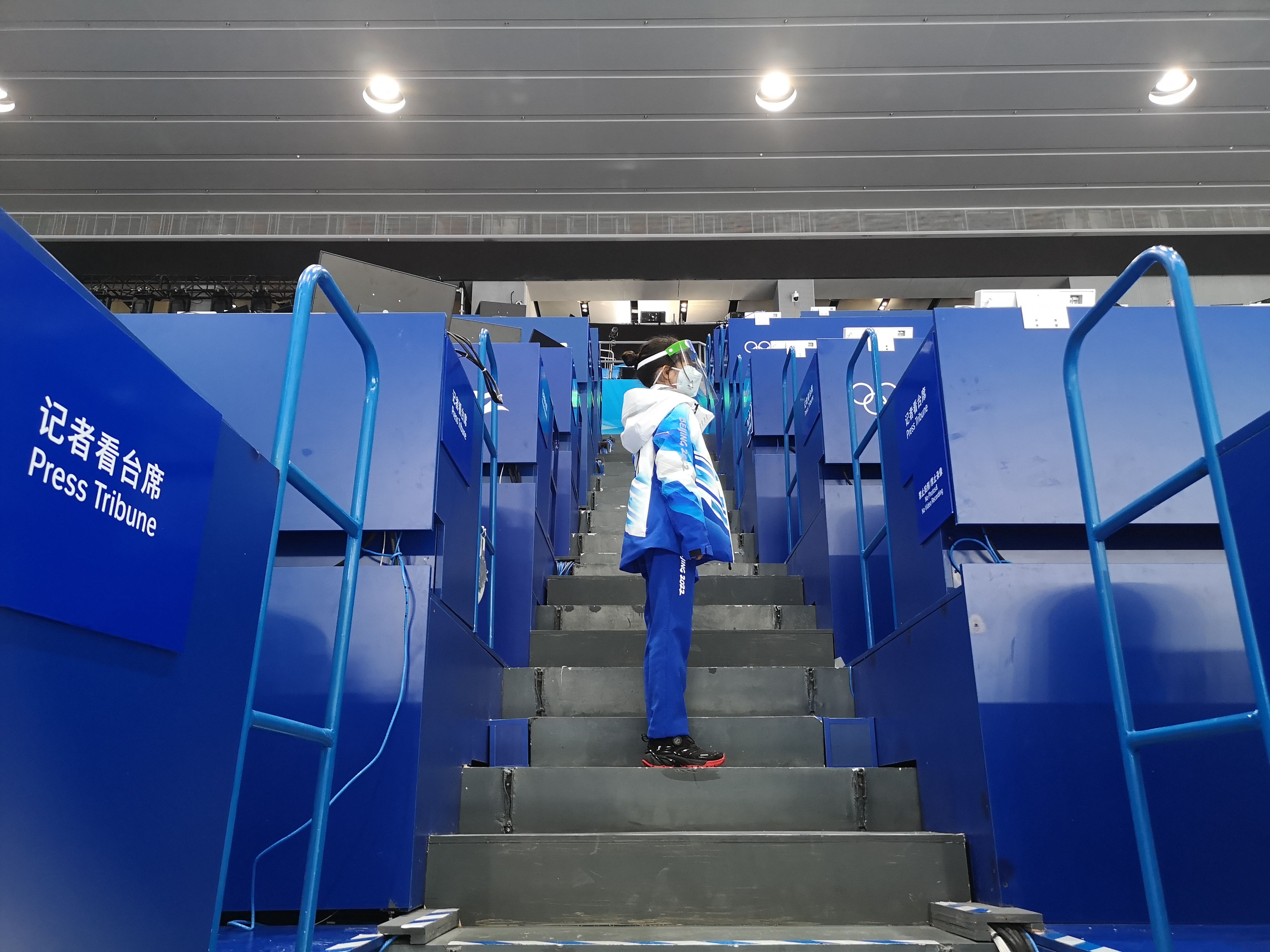 On the press tribune of the main rink in Capital Indoor Stadium, a volunteer from Beijing Foreign Studies University gets to her post early on Feb. 14, 2022. (Source: Xinhua)