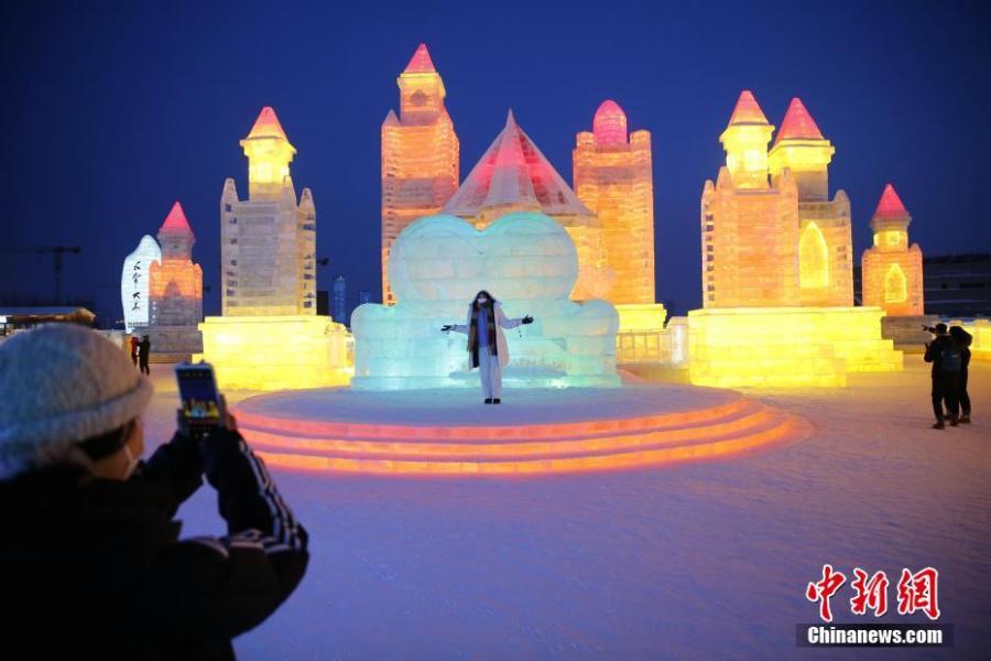 People pose for photos at Harbin Ice-Snow World in Harbin, northeast China's Heilongjiang Province, Feb. 21, 2022.