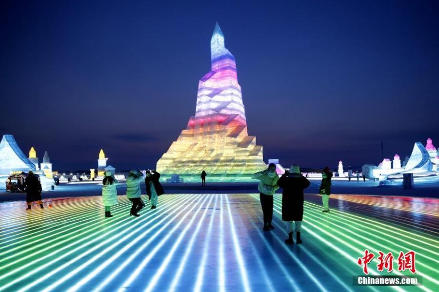 People pose for photos at Harbin Ice-Snow World in Harbin, northeast China's Heilongjiang Province, Feb. 21, 2022.