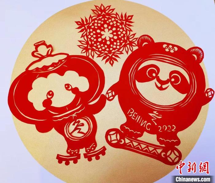 Photo shows a paper cutting artwork inspired by the mascots for the Beijing 2022 Olympic Winter Games and the Beijing 2022 Paralympic Winter Games, Bing Dwen Dwen and Shuey Rhon Rhon, as created by Fu Zhao’e, a female inheritor of the traditional craft of paper cutting in northwest China’s Ningxia Hui Autonomous Region. (Photo courtesy of the interviewee)