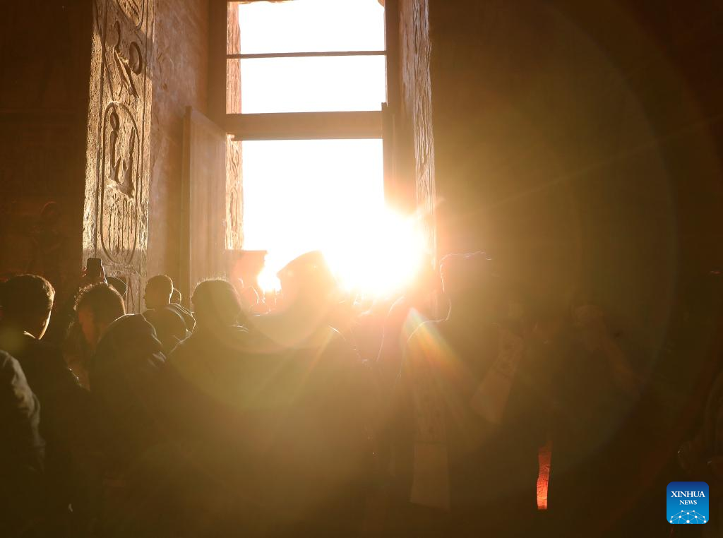 Tourists visit the Great Temple of Abu Simbel during the Sun Festival in Aswan, Egypt, Feb. 22, 2022. During the Sun Festival, crowds gather before sunrise to observe sunlight lightening the innermost sculptures including King Ramses II. The innermost sculptures remain in darkness inside the Great Temple of Abu Simbel throughout the year except on Feb. 22 and Oct. 22, when the sunlight showers on the sculptures to commemorate the king's coronation and birthday. (Xinhua/Wang Dongzhen)
