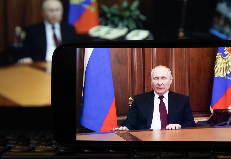 Photo taken on Feb. 21, 2022 shows a screen displaying Russian President Vladimir Putin speaking during a televised address to the nation in Moscow, Russia.(Xinhua/Bai Xueqi)