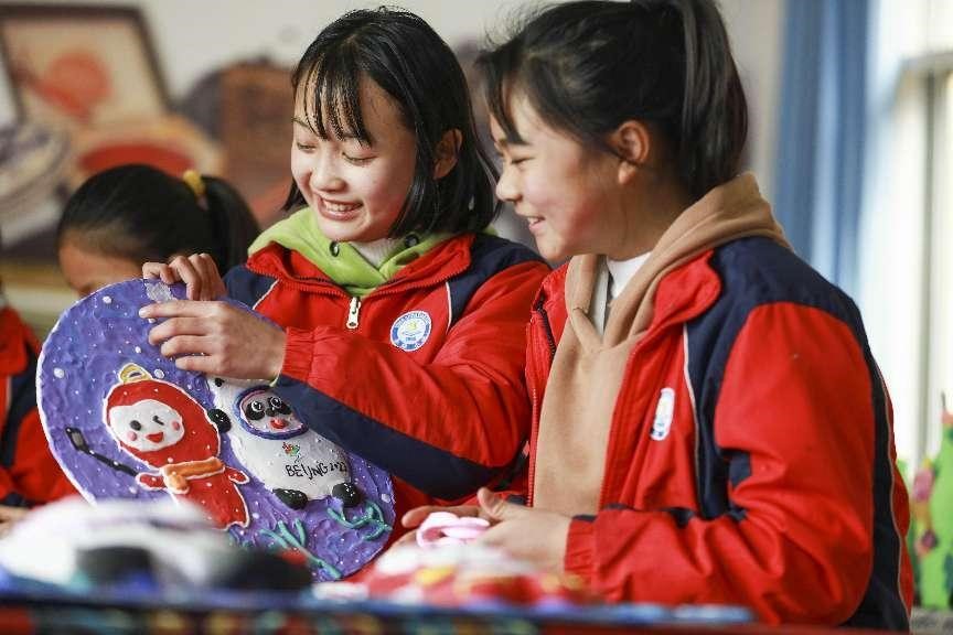 Students at an elementary school in Yongshen Yi and Miao township, Qianxi city, southwest China’s Guizhou province, make artworks featuring Bing Dwen Dwen and Shuey Rhon Rhon, official mascots of Beijing 2022 Olympic and Paralympic Winter Games, with super-light clay, Feb. 13, 2022. (People’s Daily Online/ Zhou Xunchao)