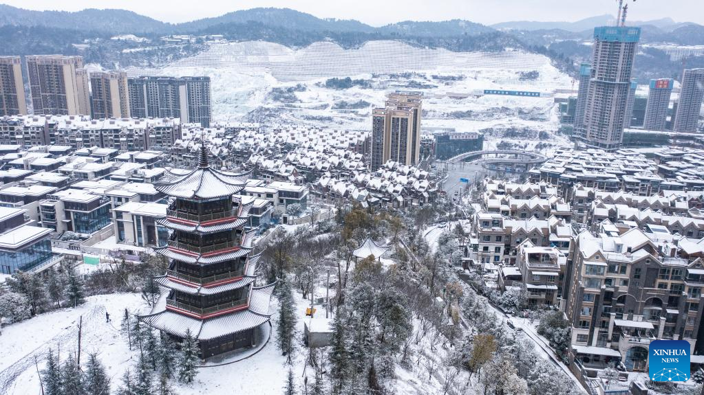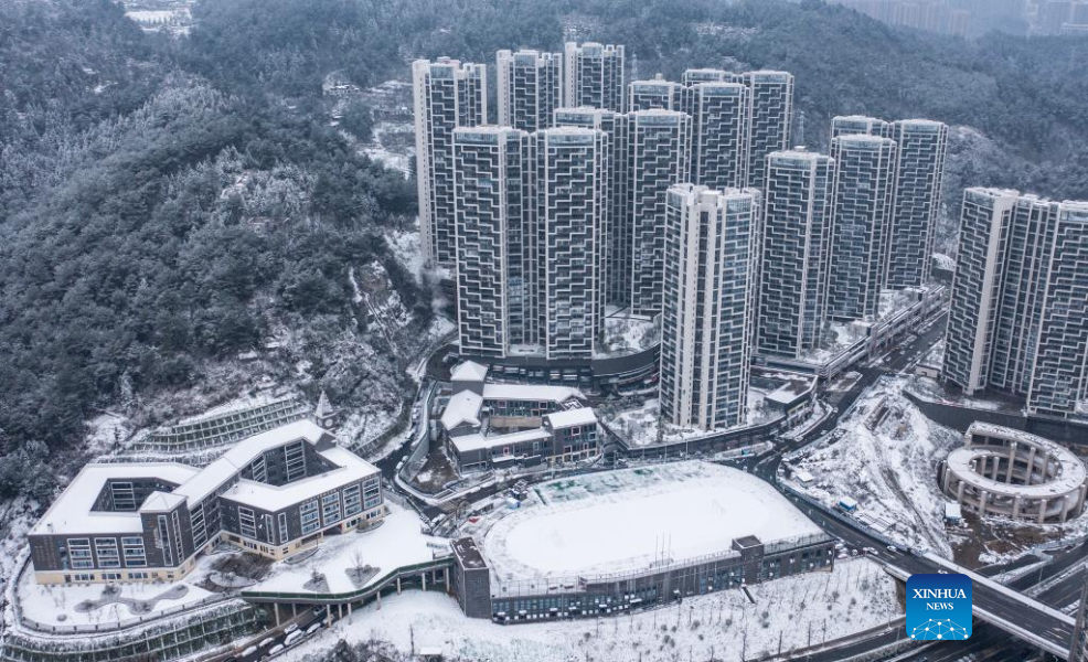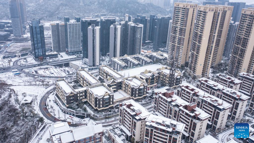 Aerial photo taken on Feb. 22, 2022 shows a snow-covered residential compound in Guiyang, capital of southwest China's Guizhou Province. (Xinhua/Tao Liang)