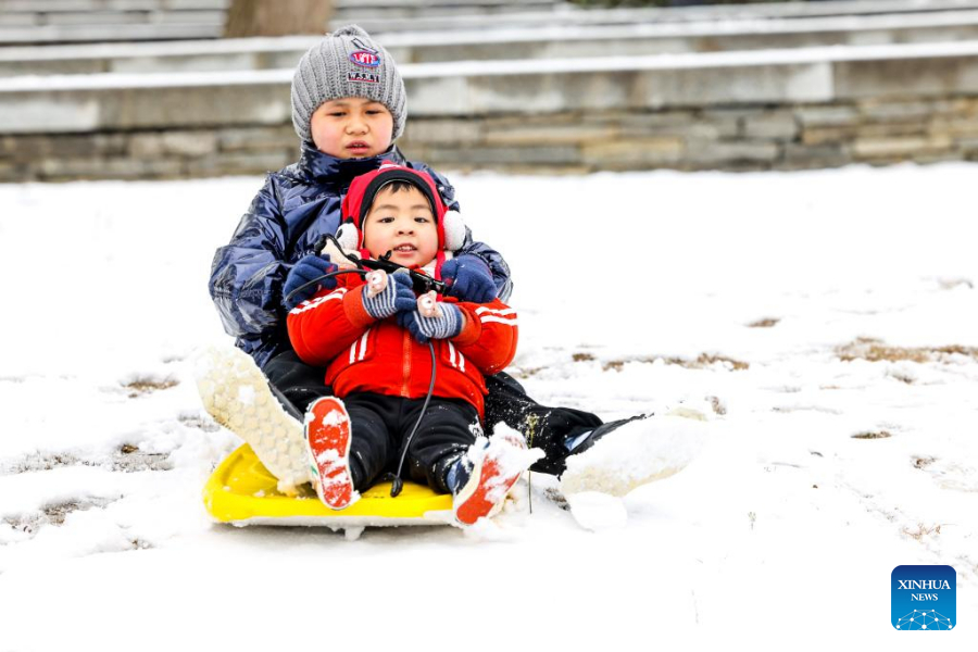 Children play on snow-covered field at Jinzhu Township of an economic and technological development zone in Guiyang City, southwest China's Guizhou Province, Feb. 22, 2022.