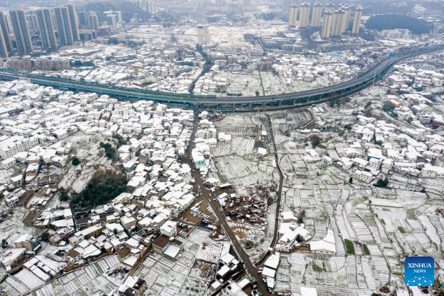 Aerial photo taken on Feb. 22, 2022 shows the snow scenery of an economic and technological development zone in Guiyang City, southwest China's Guizhou Province.