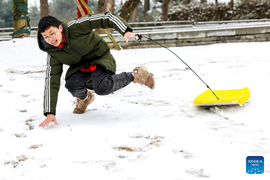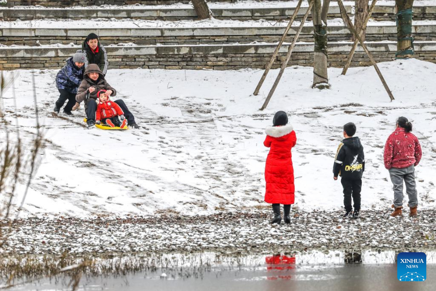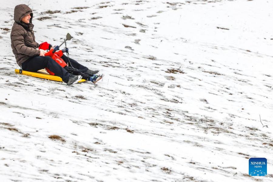 People play on snow-covered field at Jinzhu Township of an economic and technological development zone in Guiyang City, southwest China's Guizhou Province, Feb. 22, 2022.