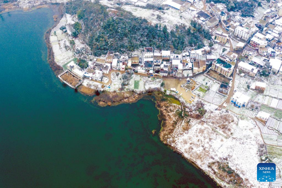 Aerial photo taken on Feb. 22, 2022 shows the snow scenery of the Aha Lake National Wetland Park in Guiyang City, southwest China's Guizhou Province.