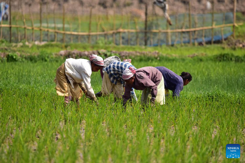 Farmers uproot rice seedlings at a paddy field in Mayong village, Morigaon district of India's northeastern state of Assam, Feb. 22, 2022. (Str/Xinhua)