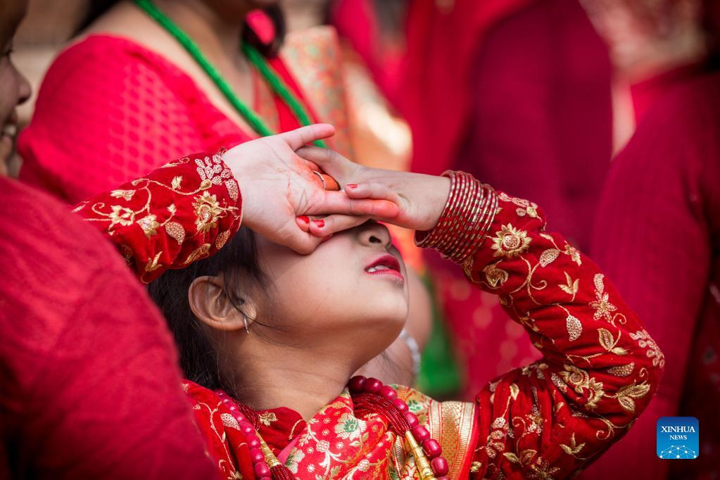 A girl worships the Sun during a puberty ceremony known as Gufa in Lalitpur, Nepal, Feb. 23, 2022. (Photo by Hari Maharjan/Xinhua)