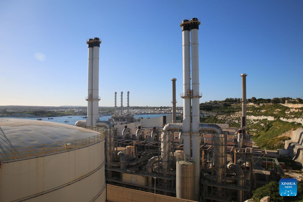 Photo taken on Feb. 23, 2022 shows a view of the Delimara power station in Marsaxlokk, southeastern Malta. The Delimara 3 (D3) power station, controlled and operated by China's Shanghai Electric Power (Malta) Holding Co., Ltd. (SEP), has played an important role in power supply in Malta, and emission reduction and air quality improvement in the areas around the power plant. The D3 station was turned from a heavy oil-fired power station into a gas-fired one by the SEP. (Xinhua/Chen Wenxian)