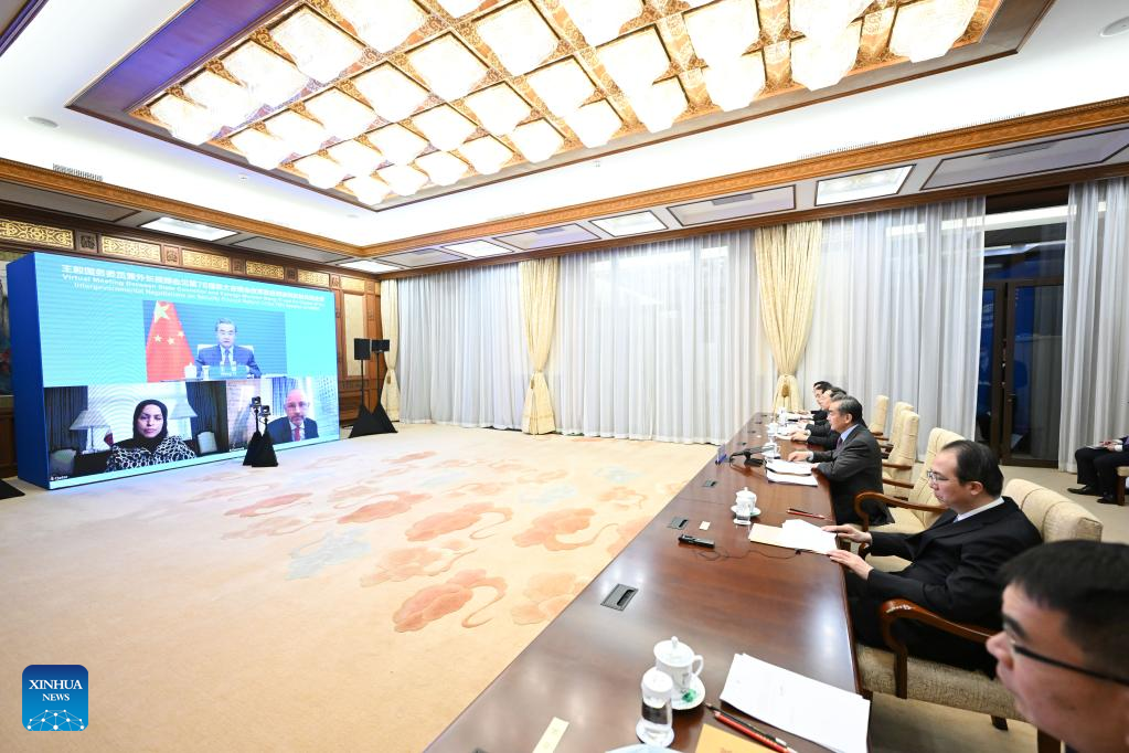 BEIJING, Feb. 23 (Xinhua) -- Chinese State Councilor and Foreign Minister Wang Yi met with Alya Ahmed Saif Al-Thani and Martin Bille Hermann, co-chairs of the Intergovernmental Negotiations (IGN) on the United Nations Security Council Reform of the 76th Session of the UN General Assembly, through video link Tuesday.