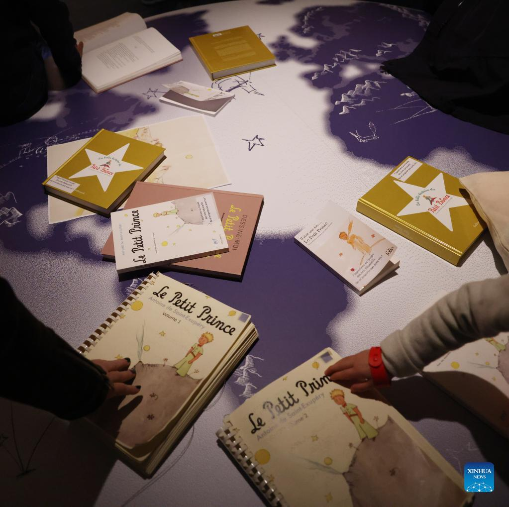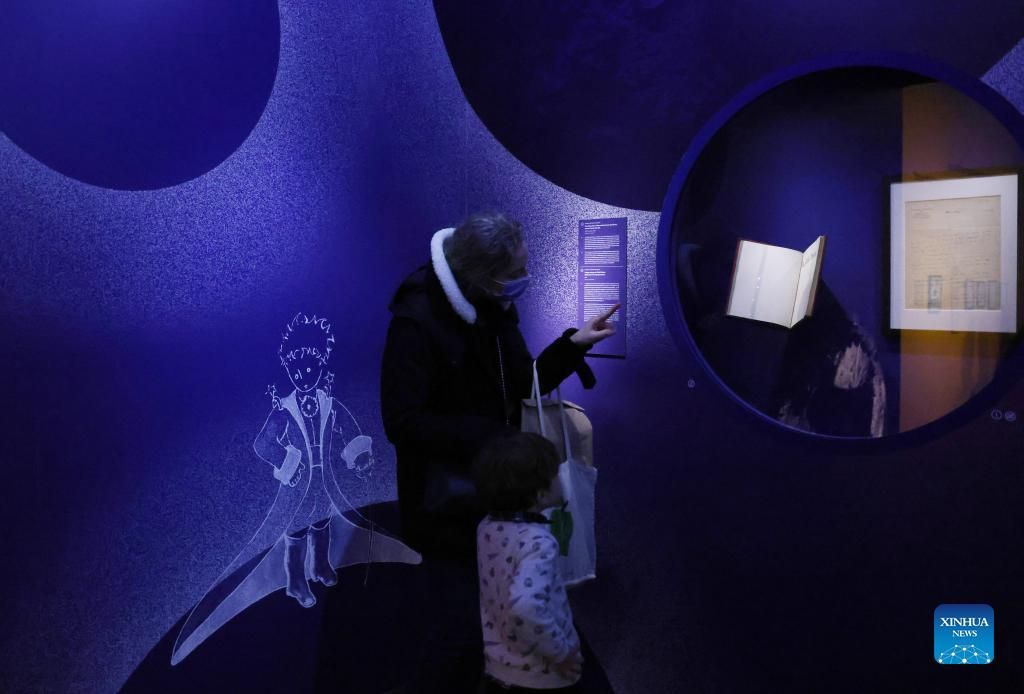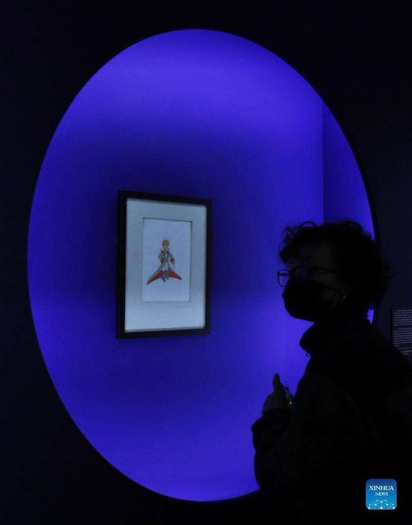 People visit the exhibition "A la Rencontre du Petit Prince" (Meet the Little Prince) at the Musee des Art Decoratifs de Paris, in Paris, France, Feb. 23, 2022. The exhibition features some 600 artworks by the French writer, designer and illustrator Antoine de Saint-Exupery, including the original manuscript for the first time exhibited in France. The exhibition runs from Feb. 17 to June 26, 2022. (Xinhua/Gao Jing)