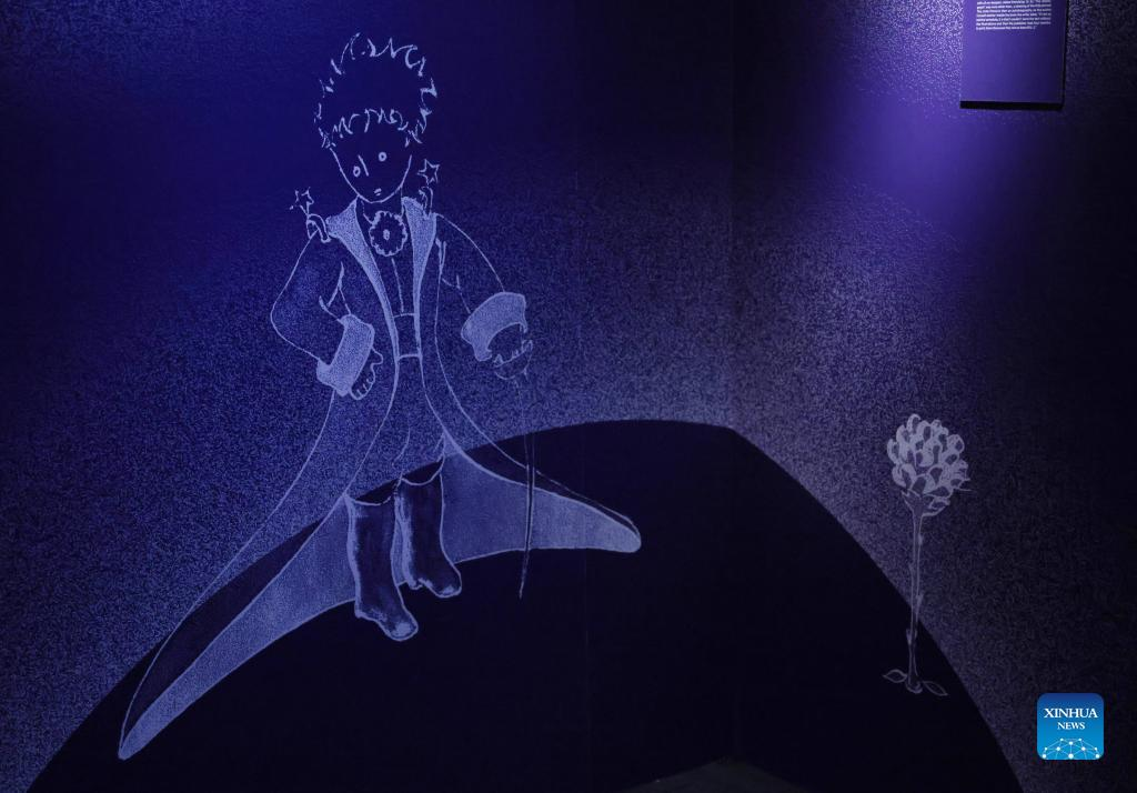 An installation showing works related to the literary masterpiece "The Little Prince" by French writer Antoine de Saint-Exupery is seen during the exhibition "A la Rencontre du Petit Prince" (Meet the Little Prince) at the Musee des Art Decoratifs de Paris, in Paris, France, Feb. 23, 2022. The exhibition features some 600 artworks by the French writer, designer and illustrator Antoine de Saint-Exupery, including the original manuscript for the first time exhibited in France. The exhibition runs from Feb. 17 to June 26, 2022. (Xinhua/Gao Jing)