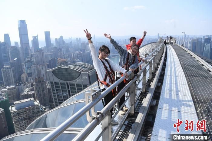 Visitors pose for photo on a skyscraper in southwest China's Chongqing Feb. 23, 2022. (Photo: China News Service/Zhang Chao)
