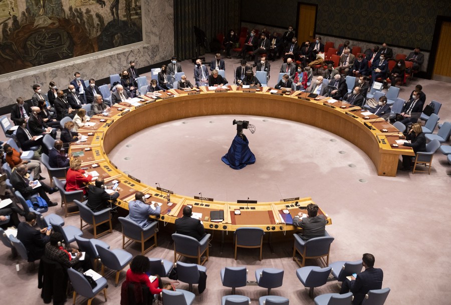 Photo taken on Feb. 23, 2022 shows the scene of the UN Security Council emergency meeting on Ukraine at UN headquarters in New York. (Xinhua/Wang Ying)