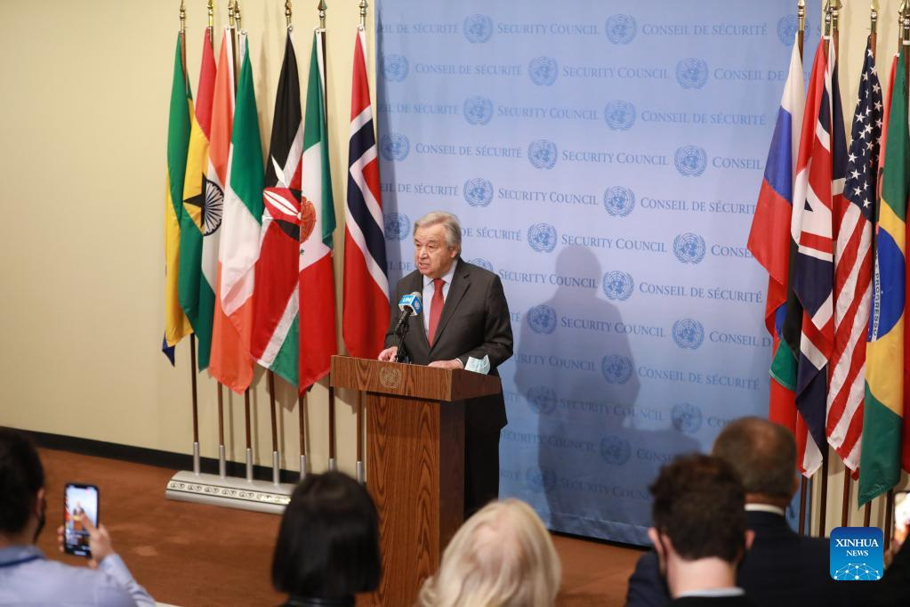 United Nations Secretary-General Antonio Guterres speaks to the press at the UN headquarters in New York, on Feb. 24, 2022. Guterres announced Thursday that the world body will allocate 20 million U.S. dollars from the Central Emergency Response Fund (CERF) to meet the urgent needs in Ukraine, which is in the midst of a military conflict with Russia. (Xinhua/Xie E)