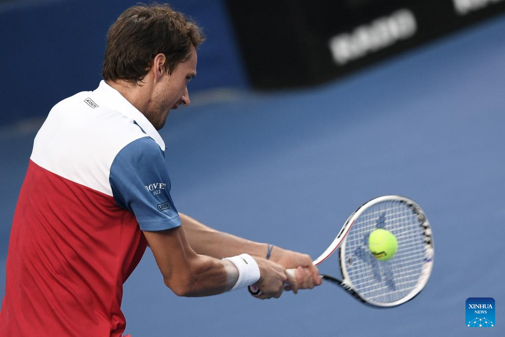 Daniil Medvedev of Russia hits a return during the men's singles round of 16 match between Daniil Medvedev of Russia and Pablo Andujar of Spain at the 2022 ATP Mexican Open tennis tournament in Acapulco, Mexico, Feb. 23, 2022. (Xinhua/Xin Yuewei)