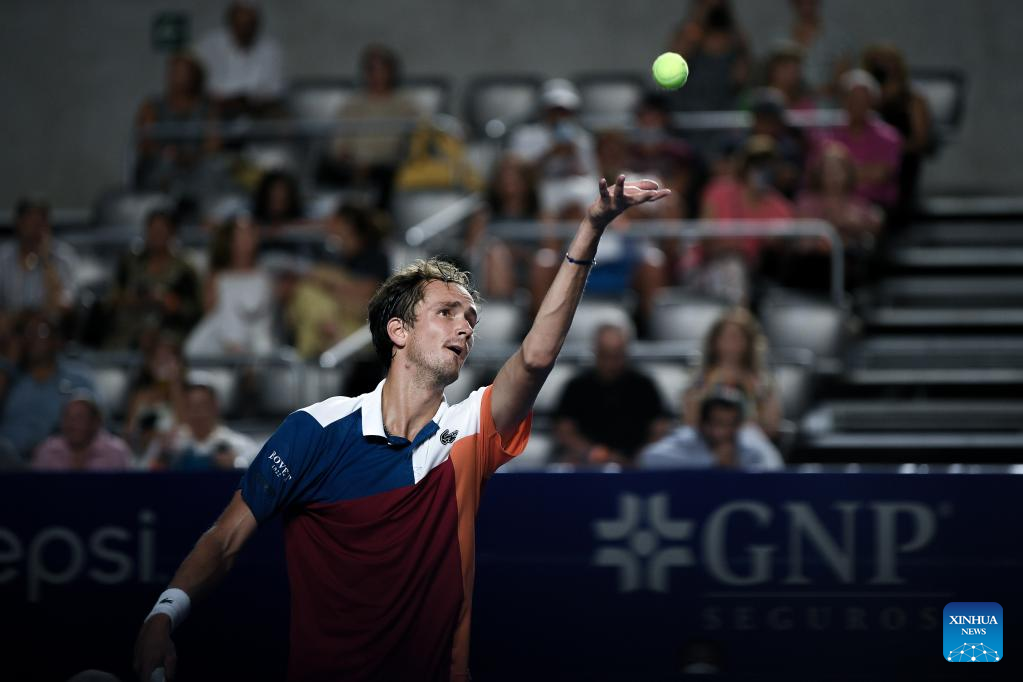 Daniil Medvedev of Russia serves during the men's singles round of 16 match between Daniil Medvedev of Russia and Pablo Andujar of Spain at the 2022 ATP Mexican Open tennis tournament in Acapulco, Mexico, Feb. 23, 2022. (Xinhua/Xin Yuewei)