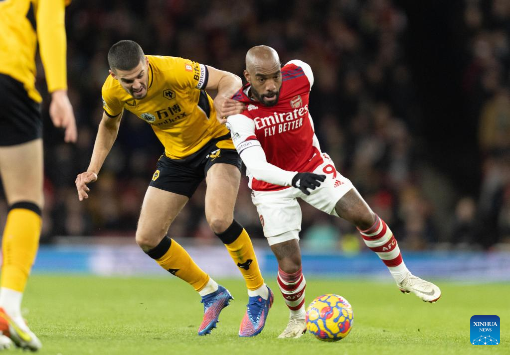 Arsenal's Alexandre Lacazette (R) gets away from Wolverhampton Wanderers' captain Conor Coady during the English Premier League match between Arsenal and Wolverhampton Wanderers in London, Britain, on Feb. 24, 2022. (Xinhua)