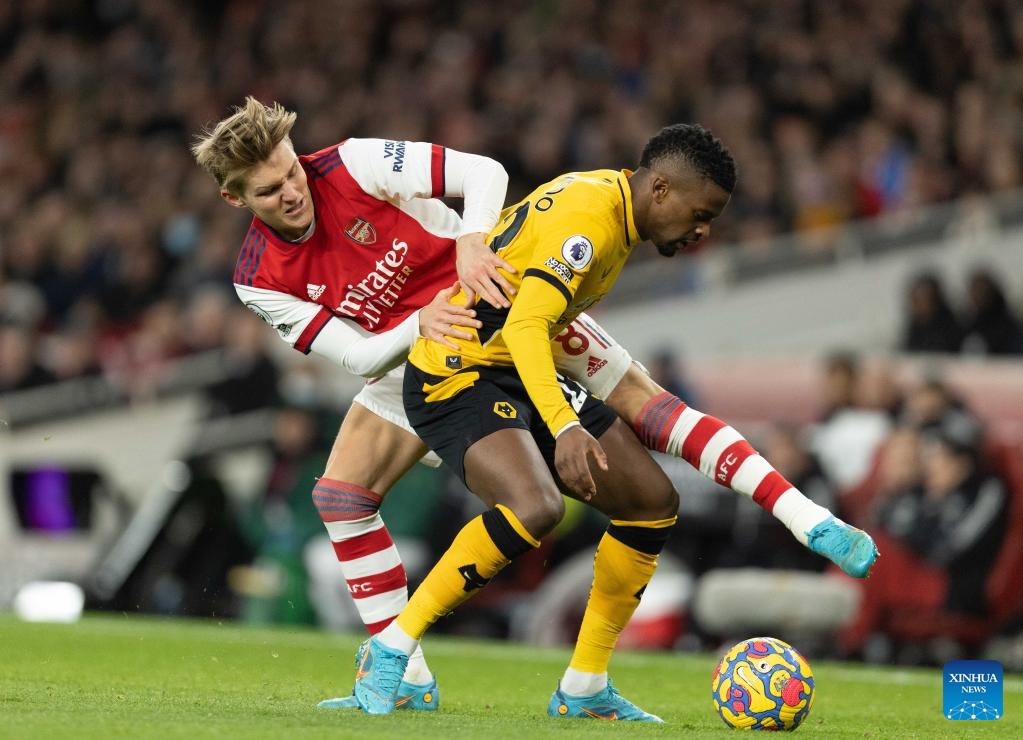 Arsenal's Martin Odegaard (L) challenges Wolverhampton Wanderers' Nelson Semedo during the English Premier League match between Arsenal and Wolverhampton Wanderers in London, Britain, on Feb. 24, 2022. (Xinhua)