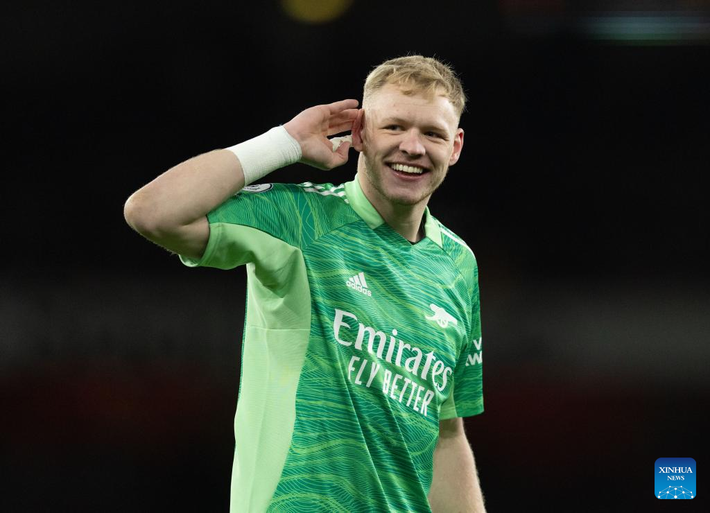 Arsenal's goalkeeper Aaron Ramsdale celebrates after the English Premier League match between Arsenal and Wolverhampton Wanderers in London, Britain, on Feb. 24, 2022. (Xinhua)