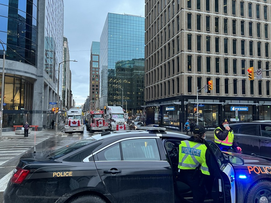 A police car blocking the road is seen in Ottawa, Canada, Feb. 10, 2022. (Xinhua/Lin Wei)