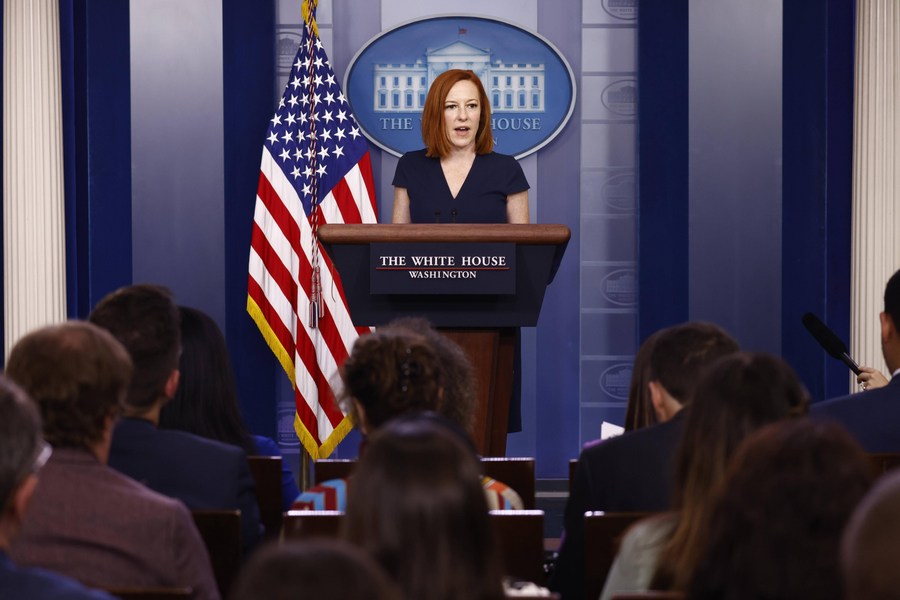 White House press secretary Jen Psaki (Rear) speaks during a press briefing at the White House in Washington, D.C., the United States, on June 8, 2021. (Photo by Ting Shen/Xinhua)