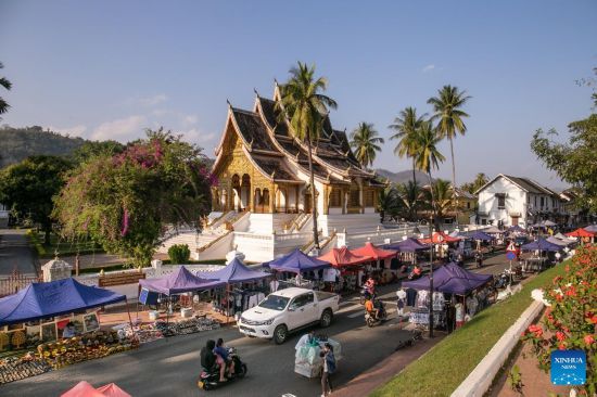 Photo taken on Feb. 25, 2022 shows a view of the ancient town of Luang Prabang, in Laos. The Laos-China Railway was put into operation in December of 2021, which helped reviving the domestic tourism of Laos. At present, the demand of passengers travelling between Vientiane and the ancient capital of Luang Prabang is growing.