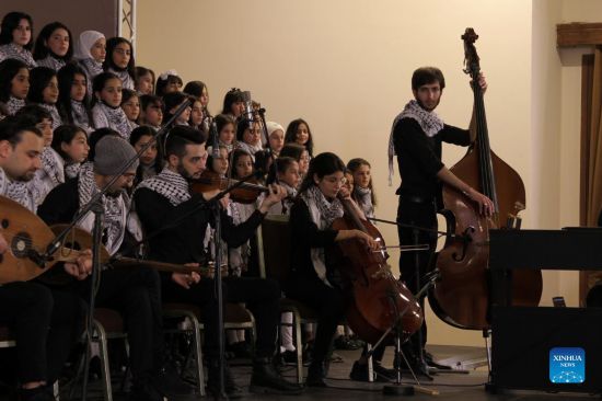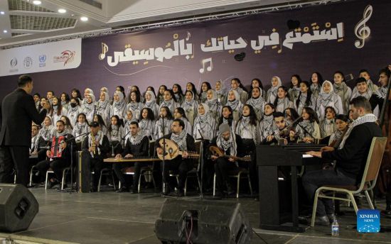 Palestinian children participate in a concert "Enjoy Your Life with Music" in Gaza City, on Feb. 26, 2022. (Photo by Rizek Abdeljawad/Xinhua)