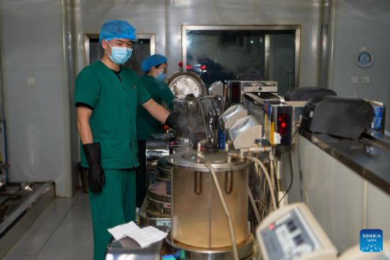 A pharmacist makes traditional Chinese medicine (TCM) at the Inner Mongolia Autonomous Region Hospital of Traditional Chinese Medicine in Hohhot, north China's Inner Mongolia Autonomous Region, Feb. 25, 2022. Amid the lastest resurgence of COVID-19, the Inner Mongolia Autonomous Region Hospital of Traditional Chinese Medicine has been engaging in the fight against the disease by applying TCM. (Xinhua/Li Zhipeng)