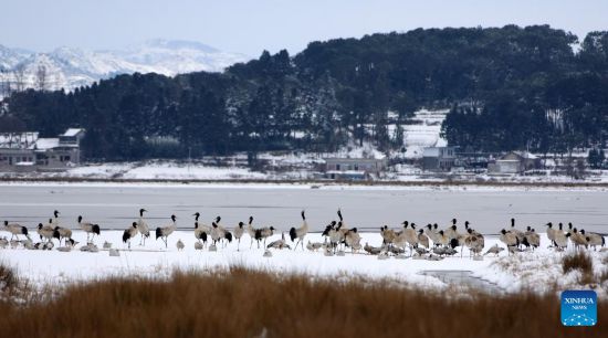 Black-necked cranes and other migrant birds are seen at the Caohai National Nature Reserve in Weining Yi, Hui and Miao Autonomous County, southwest China's Guizhou Province, Feb. 22, 2022. Caohai was listed as a national nature reserve in 1992 and is an important wintering ground and migration transfer station for birds such as black-necked cranes, grey cranes and spotted geese. (Photo by He Huan/Xinhua)
