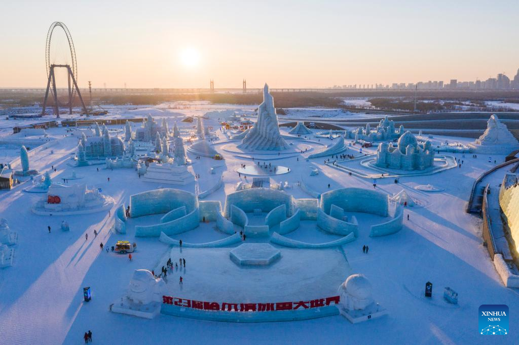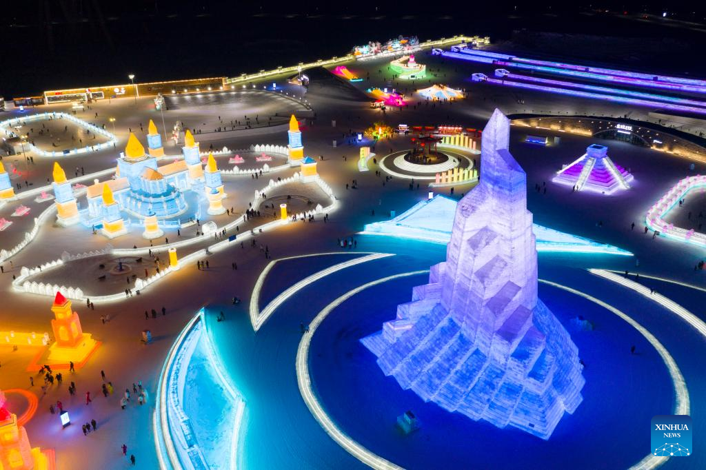 Aerial photo shows tourists visiting the Harbin Ice-Snow World in Harbin, northeast China's Heilongjiang Province, Feb. 27, 2022. The 23rd Harbin Ice-Snow World closed on Sunday. (Xinhua/Xie Jianfei)