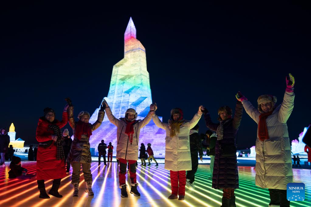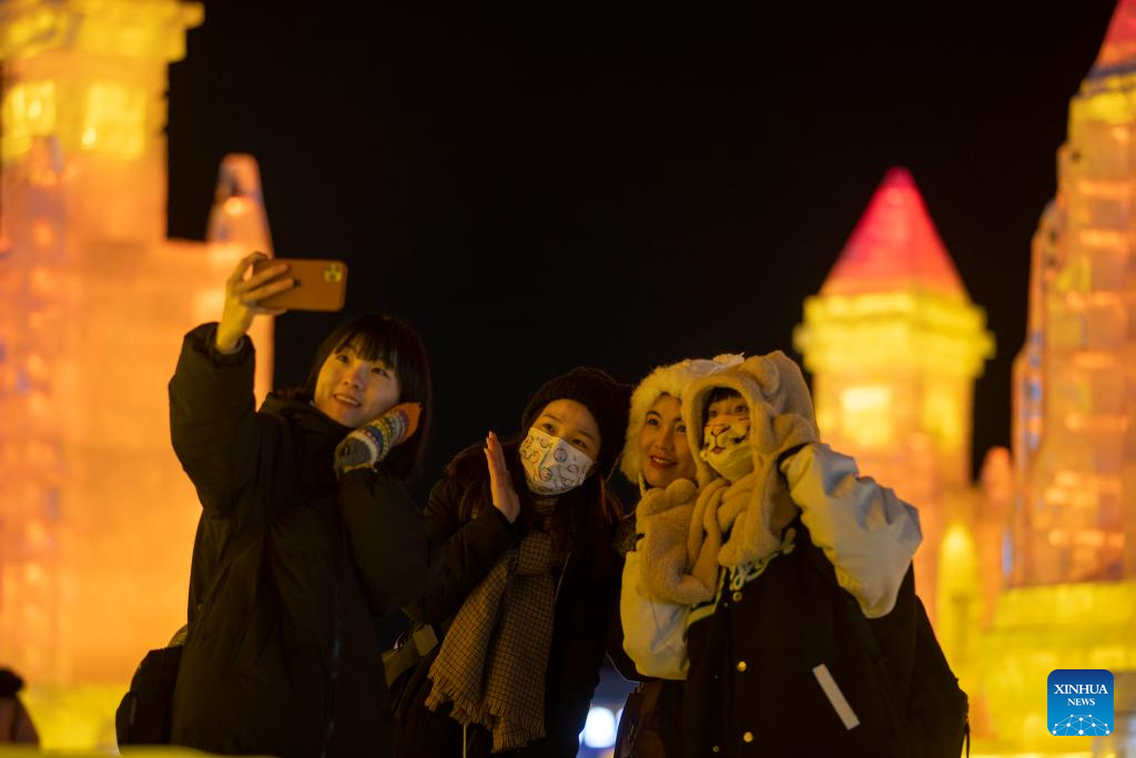Tourists pose for photo at the Harbin Ice-Snow World in Harbin, northeast China's Heilongjiang Province, Feb. 27, 2022. The 23rd Harbin Ice-Snow World closed on Sunday. (Xinhua/Zhang Tao)