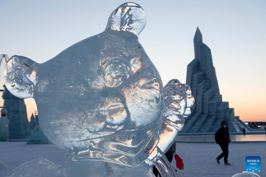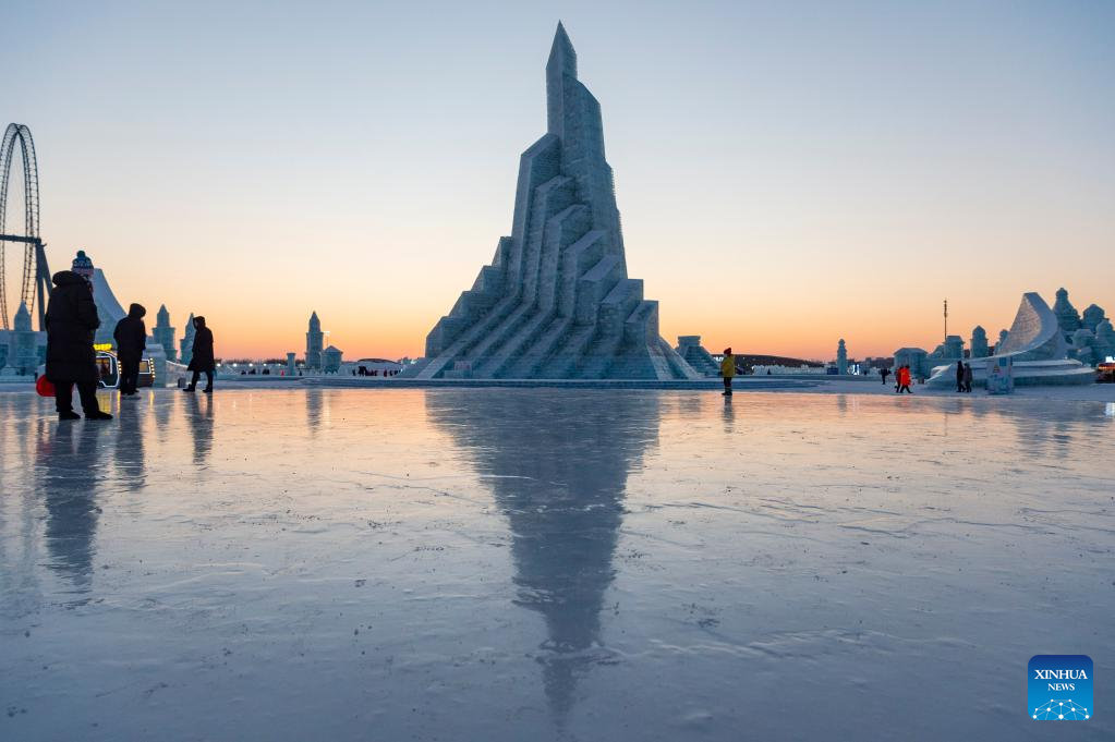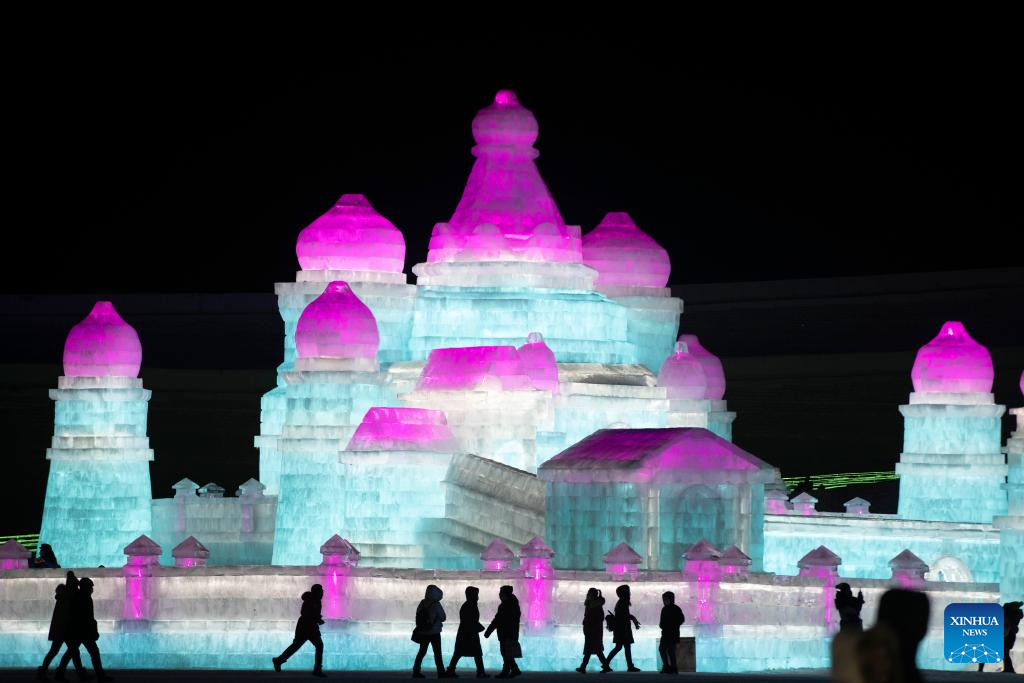 Tourists visit the Harbin Ice-Snow World in Harbin, northeast China's Heilongjiang Province, Feb. 27, 2022. The 23rd Harbin Ice-Snow World closed on Sunday. (Xinhua/Zhang Tao)